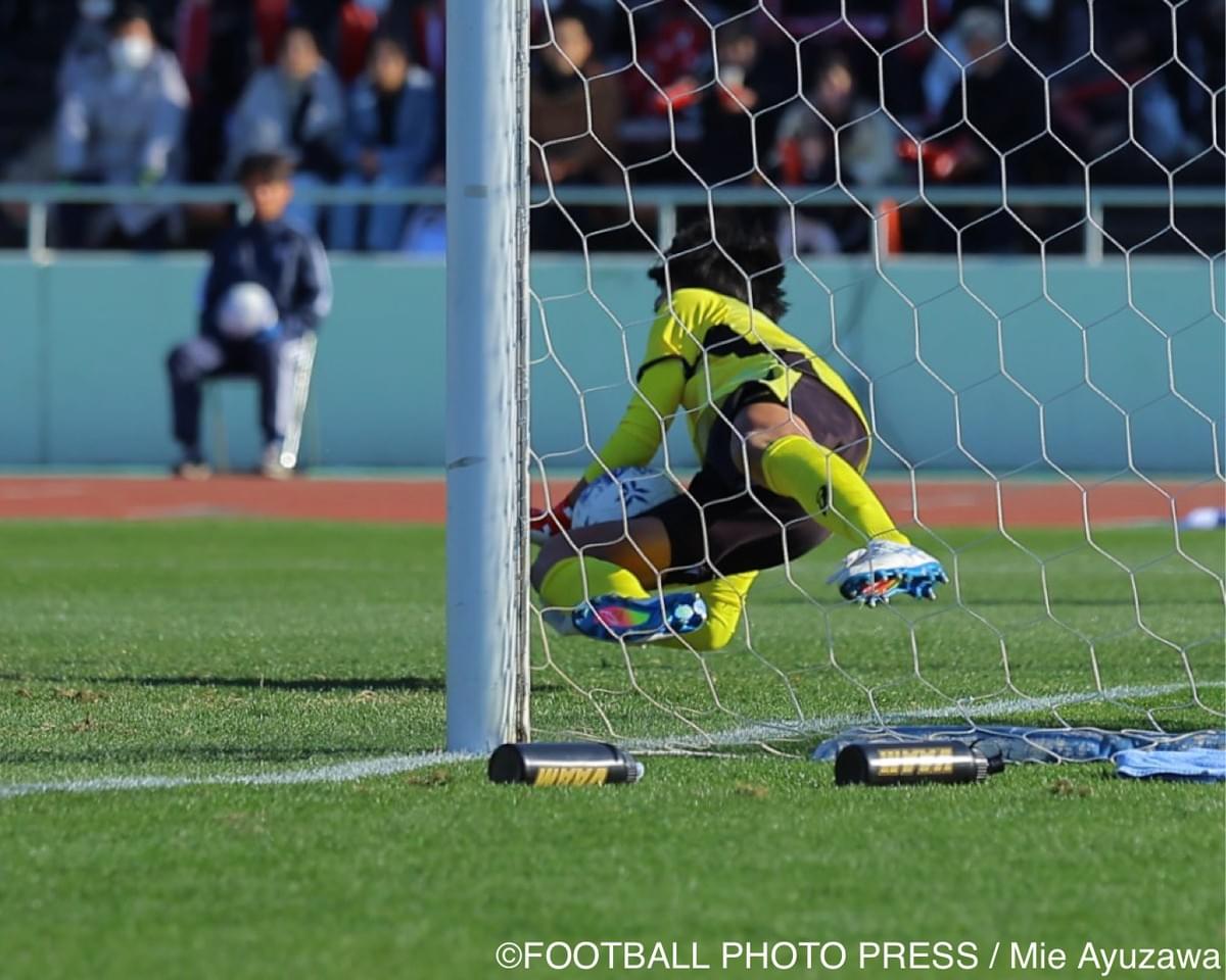 後半、PKを与える苦しい場面。山梨学院高/GK石井那樹が相手シュートを止め、最大のピンチを凌いだ。